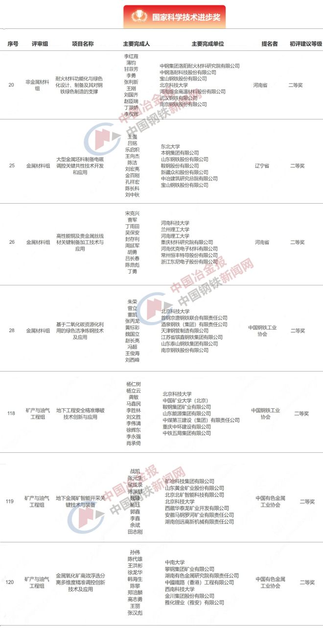 4月8日,科學技術部發布《國家科學技術獎勵工作辦公室公告第100號》,公告顯示2023年度國家科學技術獎初評工作已經結束。初評共通過國家自然科學獎通用項目59項、國家技術發明獎通用項目52項、國家科學技術進步獎通用項目132項,均在國家科技管理信息係統公共服務平台(https://service.most.gov.cn/jl)予以公布。其中,涉及鋼鐵相關領域的國家自然科學獎項目共4項、國家技術發明獎1獎、國家科學技術進步獎項目7項!