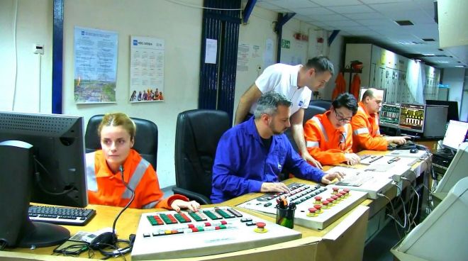 河鋼塞鋼中塞員工在熱軋主控室工作。