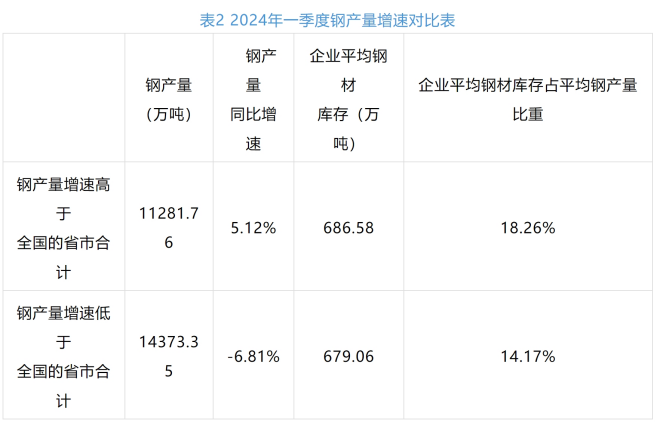 從一季度鋼產量增速情況看(見表2),鋼產量增速高於全國的省市,企業平均鋼材庫存占平均鋼產量比重更大。