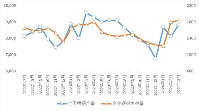 通過對2022年7月至2024年2yuegeyuequanguocugangchanliangyuzhongdiantongjigangtieqiyeyuemogangcaikucunliangjinxingxiangguanxingfenxi,quanguocugangchanliangyuzhongdiantongjigangtieqiyeyuemogangcaikucunliangxiangguanxishuwei0.43,為中度正相關(見圖1)。其中2023年3月生產粗鋼9573萬噸,為2022年7月以來最高值,對應著該月月末鋼材庫存量為1725萬噸,為較高值;2023年12月生產粗鋼6744萬噸,為2022年7月以來較低值,對應著該月月末鋼材庫存量降至1236萬噸,為較低值。即產量增加,增產的鋼材一部分轉化為庫存;或產量減少,可以消耗部分已有庫存。