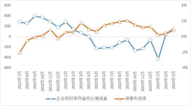 通過對2022年7月至2024年2月yue重zhong點dian統tong計ji鋼gang鐵tie企qi業ye月yue末mo鋼gang材cai庫ku存cun量liang與yu鋼gang材cai綜zong合he結jie算suan價jia格ge同tong比bi增zeng減jian進jin行xing相xiang關guan性xing分fen析xi,鋼gang材cai庫ku存cun量liang與yu鋼gang材cai綜zong合he結jie算suan價jia格ge同tong比bi增zeng減jian相xiang關guan係xi數shu為wei-0.47,為中度負相關(見圖4)。其中2023年4月末鋼材庫存量為1811萬噸,為2022年7月以來較高值,對應著該月鋼材綜合結算價格同比下降811元/噸,為較低值;2023年12月末鋼材庫存量為1236萬噸,為2022年7月以來較低值,對應著該月鋼材綜合結算價格同比下降7元/dun,weizuigaozhi。dangshichanggongyingguoshengshi,gangcaijiagekenengxiajiang,jigaokucunliangtongchangyiweizheshichangxuqiubuzuyixiaohuadangqiandeshengchanliang,daozhigangtieqiyebudebujiangdijiageyicijixiaoshou。