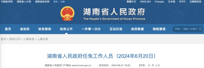 6月21日,湖南省人民政府網站發布了《任免工作人員(2024年6月20日)》。