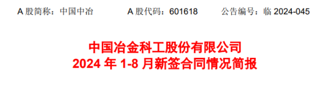 近日,中國中冶發布了《中國冶金科工股份有限公司2024年 1-8月新簽合同情況簡報》(以下簡稱《簡報》)。