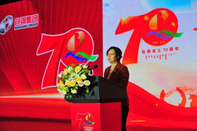 孟繁英在致辭中表示,70年來,幾代包鋼人賡續紅色根脈,開拓奮進、砥礪前行,推動包鋼取得了有目共睹的巨大成就,主要表現在不斷發展壯大、規模質量躍上新台階,推動稀土產業從無到有、綜合實力跨上新高峰,科技自立自強、創新驅動取得新突破,體製機製變革、管理水平得到新提升,共同繁榮發展、民族團結取得新進步,加強黨建、從嚴治黨達到新高度等方麵。