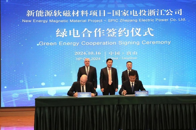 新能源軟磁材料項目,遷西縣委副書記、縣政府縣長田文學,安米集團副總裁、中國區首席執行官桑傑·沙瑪,中國東方集團執行董事兼首席財務官韓力分別代表三方簽約;綠電項目,安米集團中國區戰略項目總經理費爾南多·特謝拉與國家電投集團浙江公司黨委書記、董事長李強分別代表雙方簽約。