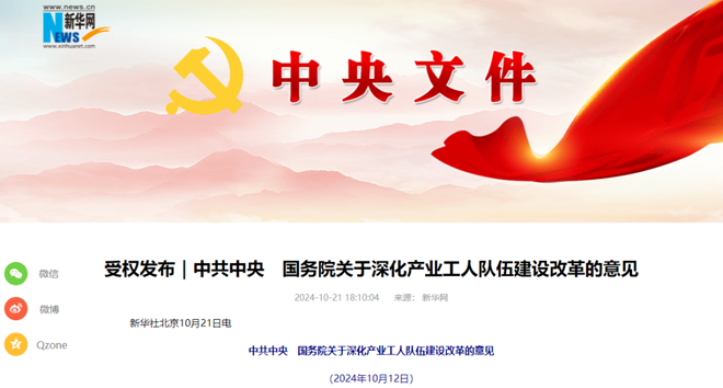 10月21日,新華網發布了《中共中央 國務院關於深化產業工人隊伍建設改革的意見》(以下簡稱《意見》)一文。