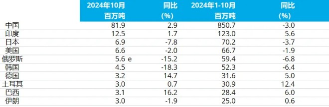 e - 預估值。排名依據為本年度累計粗鋼產量。