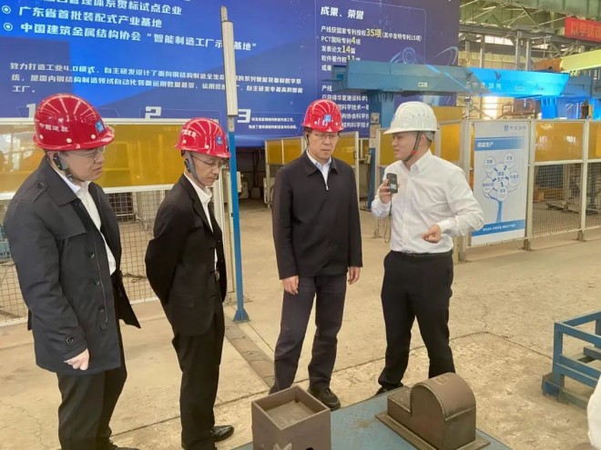 11月26日,中國鋼鐵工業協會副會長夏農一行赴廣東,到訪中建鋼構股份有限公司(下稱中建鋼構)調研鋼結構建築產業鏈有關情況。