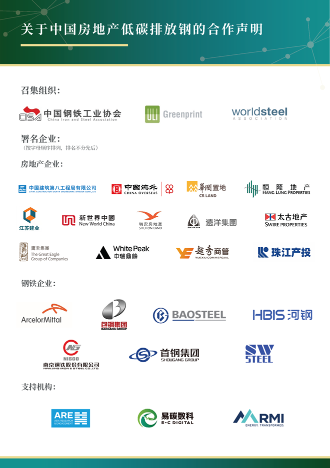 來自世界鋼鐵協會的會員企業中國寶武集團寶鋼股份、河鋼集團、首鋼集團、南鋼集團、包鋼集團以及安賽樂米塔爾等企業簽署了《合作聲明》,首批簽署的企業及機構還包括恒隆地產、太古地產、瑞安地產、遠洋集團等領先的房地產開發企業和相關支持機構。