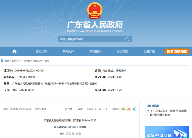 12月23日,廣東省人民政府網站發布了關於印發《廣東省2024—2025年節能降碳行動方案》的通知(以下簡稱《通知》)。
