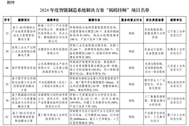 名單共遴選出83個智能製造係統解決方案“揭榜掛帥”項目,其中包含鋼鐵行業項目共6項。