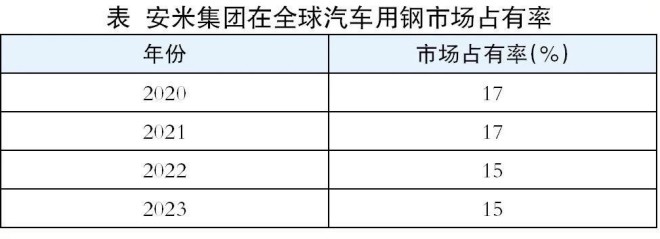 安賽樂米塔爾集團2023年粗鋼產量約6852萬噸,在全球15個國家擁有多個生產基地,客戶遍布140個國家,產量排名僅落後於中國寶武,居世界第二。2020年以來,安米集團在全球汽車用鋼市場的占有率始終保持在15%以上(如表所示)。