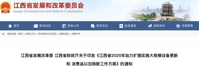 近日,江西省發展改革委、江西省財政廳印發《江西省2025年加力擴圍實施大規模設備更新和消費品以舊換新工作方案》(以下簡稱《方案》)。