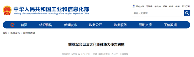 近日,工業和信息化部副部長熊繼軍在京會見澳大利亞駐華大使吉思德,雙方就深化工業和信息化領域合作進行交流。