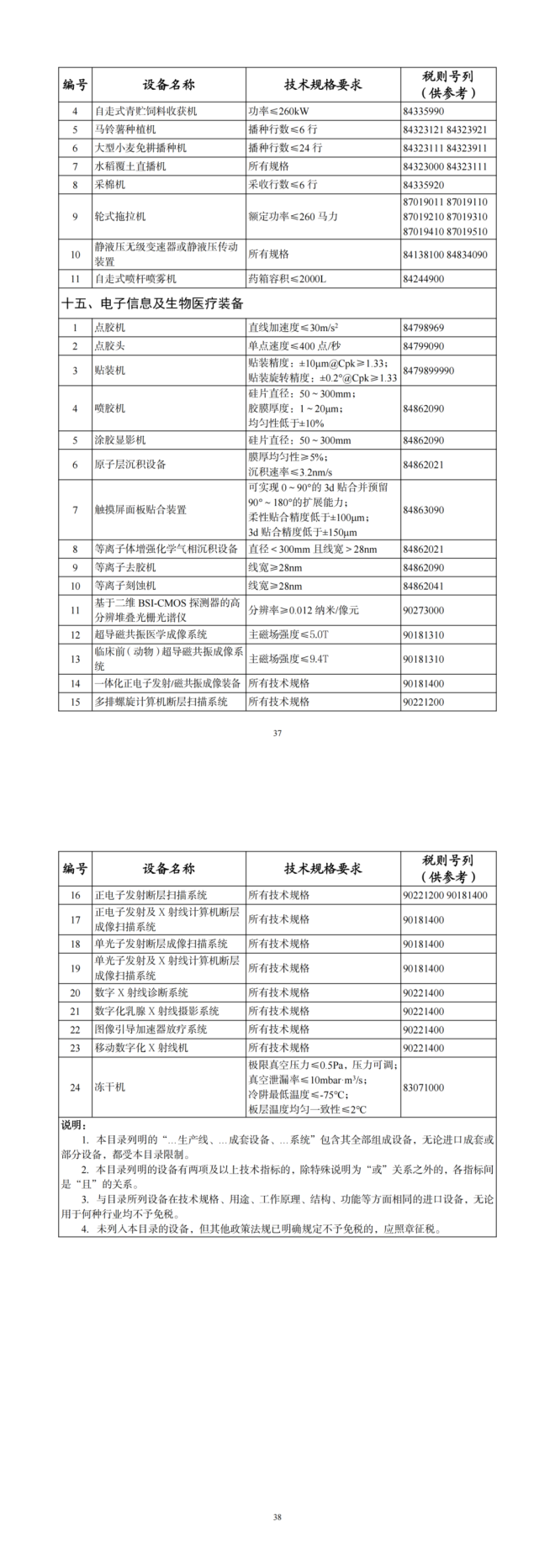 四、附件1和附件2中所列銷售業績要求僅用於確定免稅企業名單。附件2中列明執行年限的進口關鍵零部件、原材料,免稅執行期限截至該年度12月31日(含)。附件2和附件3中所列稅則號列僅供參考,具體商品範圍以設備名稱及技術規格要求為準。