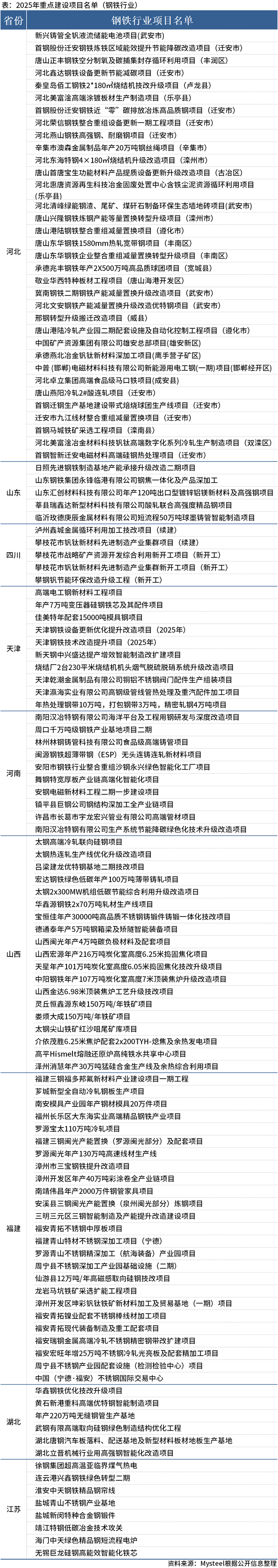 近日,河北、江蘇、 山東、天津、河南、山西、福建、湖北、四川發布2025年重點建設項目名單,其中,涉及鋼鐵行業相關項目122個。