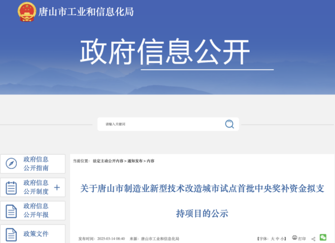 近日,唐山市工業和信息化局發布《關於唐山市製造業新型技術改造城市試點首批中央獎補資金擬支持項目的公示》。