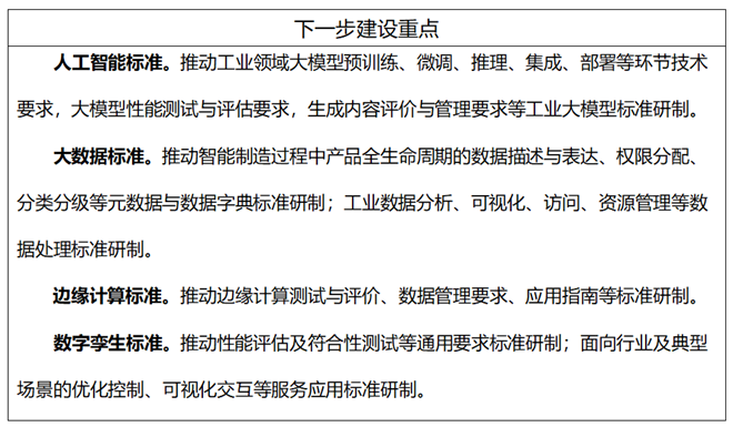 主要包括麵向工業領域的大模型、機器學習、知識圖譜的參考架構、係統要求、性能要求、測試方法、數據訓練及生成內容評價等通用要求標準;麵向工業領域重點行業及典型場景的模型、算法、知識及係統的集成、部署、應用、管理和運維等服務應用標準。