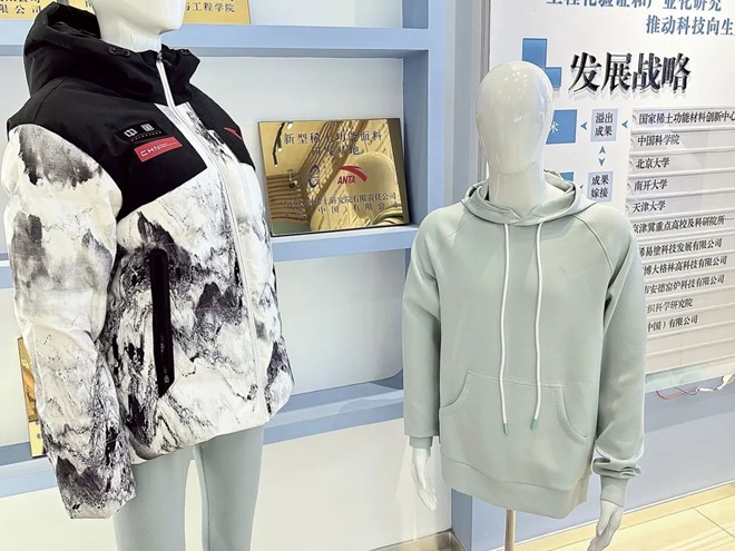 在包鋼稀土研究院天津分院與中紡院的聯合研發實驗室內,一束束“稀貝絲”在紡紗機上輕盈舞動。這些纖維中嵌入稀土納米顆粒,可吸收陽光中的紅外線並轉化為熱能。安踏最新款“熾熱科技”羽絨服便采用了稀貝絲®青曜印花麵料,讓冬季服裝厚度減少30%,保暖性卻提升50%。另一款稀貝絲®冰逸稀土冰爽防護麵料,具有瞬時涼感、隔熱、防紫外、無融滴、遮熱和抗菌效果。如今,該院已與下遊紗線廠簽訂了價值40萬餘元的該種麵料訂單,已應用到包鋼夏季工服上,化身 “降溫神器”。