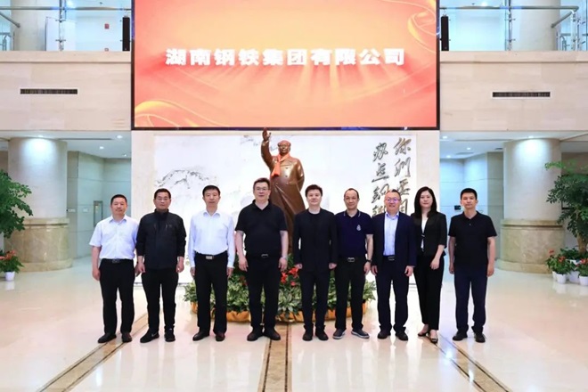 圖為會前,鋼協副會長、湖南鋼鐵集團黨委書記、董事長李建宇(左四),鋼協黨委副書記、副會長、秘書長薑維(右五)等領導在湖南鋼鐵集團大樓會麵合影。