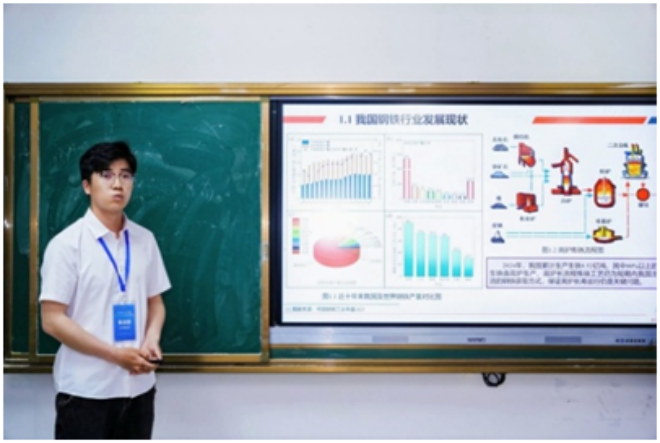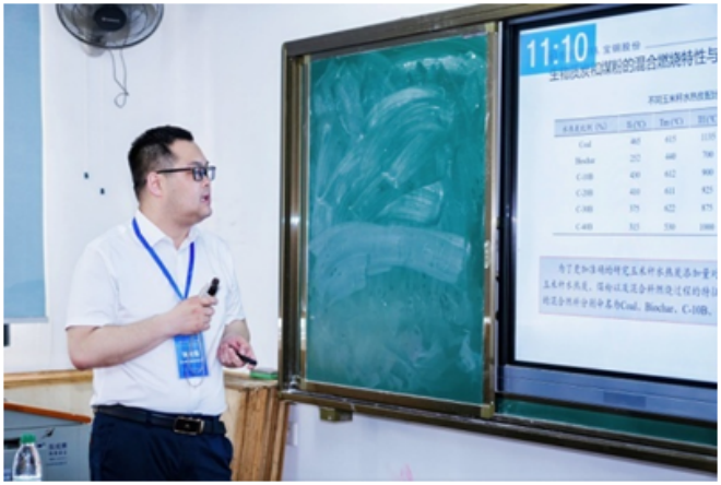▲梅鋼張光強作題為“生物質炭噴吹對煤粉燃燒和鐵礦石還原行為的影響研究”的報告