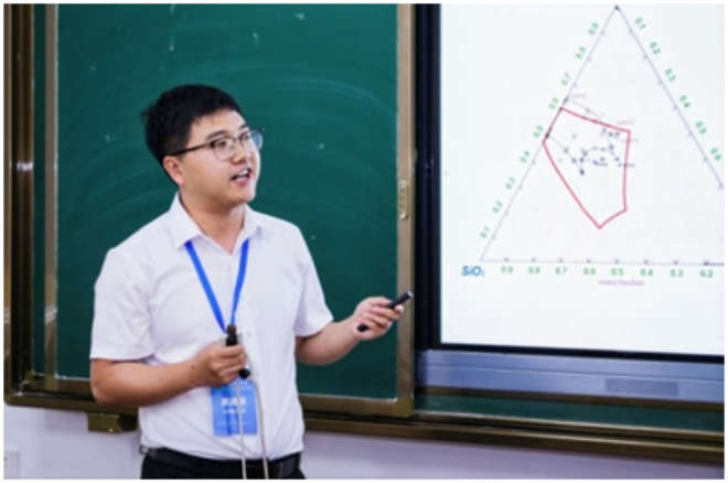 ▲蘭州理工大學景建發作題為“釩鈦磁鐵礦電爐冶煉過程CaO-MgO-SiO2-13%Al2O3-50%TiO2五元渣係相平衡研究”的報告