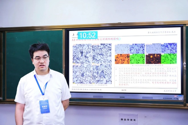 ▲武漢科技大學陳緒亨作題為“釩鈦球團回收含鐵粉塵強化固結機製”的報告