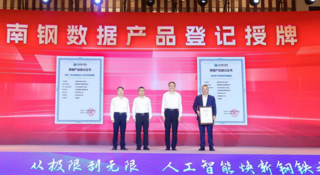 在數字化階段,南鋼創新構建了“一腦三中心”數字化運營管理體係。完成了從底層產線、到製造、到運營、到生態的全流程貫通,提升了能源、質量、交付、成本、采購營銷等業務域的全局尋優能力。南鋼在行業率先全麵啟動數據治理,啟動311工程,成為全國首批數據資產入表上市公司,榮獲全國數據要素x大賽工業製造賽道江蘇省第一名、全國第二名,成為江蘇省數據交易所首批數據產品掛牌企業。