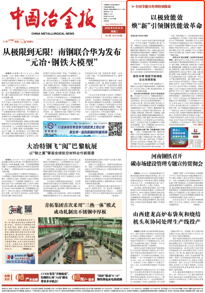 6月23日,2025年全國節能宣傳周如期而至,今年的主題是“節能增效、煥‘新’引領”。鋼鐵企業正在深入實施鋼鐵極致能效工程,生動展現該項工程帶來的深刻變革。在寶鋼股份湛江鋼鐵熱軋產線上,鋼坯以超過80%的熱裝熱送比例高效流轉,大幅降低了加熱爐燃料消耗;在首鋼京唐,“智慧鐵水”係統精準調度,將1500攝氏度鐵水運輸中的溫降穩定控製在85.4攝氏度;在鞍鋼股份鮁魚圈基地,智慧能源2.0改造推動了數智賦能冶金能源精細化管理……可以說,自2022年以來,在中國鋼鐵工業協會的推動下,鋼鐵行業積極推進一場深刻的能效革命——極致能效工程,已成為我國工業綠色轉型的先鋒與標杆。
