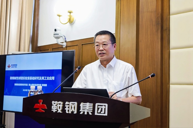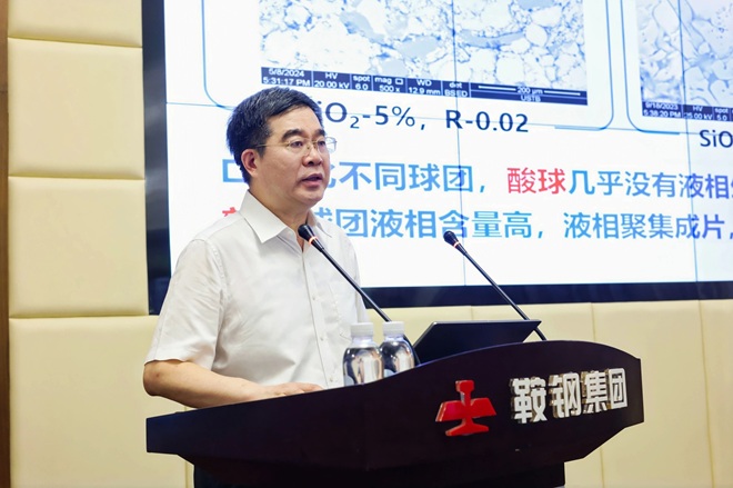 圖為鞍山鋼鐵技術中心煉鐵所首席專家周明順作《鞍鋼堿性球團實驗室基礎研究及其工業應用》主題報告
