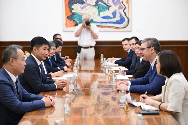 塞爾維亞當地時間7月24日,塞爾維亞總統武契奇在貝爾格萊德會見河鋼集團董事長劉鍵。中國駐塞爾維亞大使李明,塞爾維亞副總理兼經濟部長阿德裏亞娜·梅薩羅維奇、內外貿易部部長婭戈達·拉紮雷維奇,河鋼集團總會計師胡誌剛參加會見。