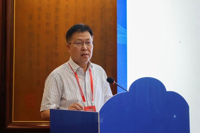 圖為王喆做題為《推動高效能熱軋型鋼在建築工程應用——研究與實踐》的主旨報告