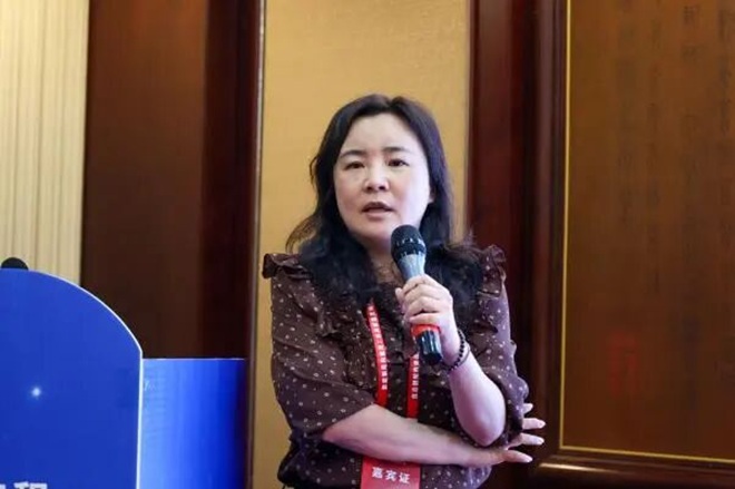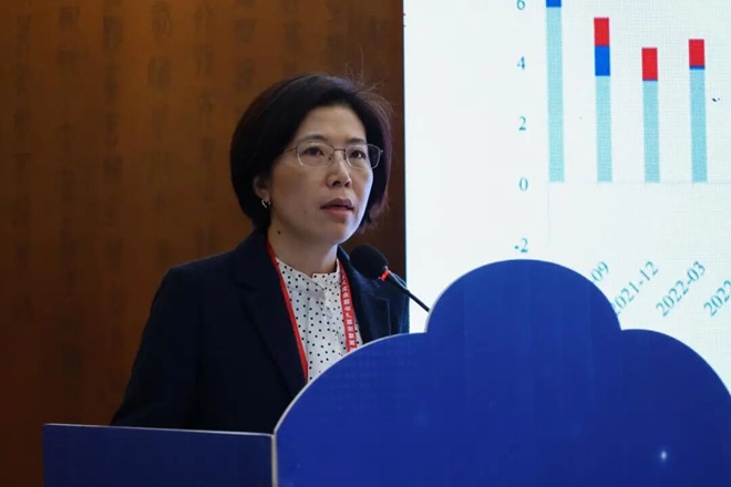圖為任竹倩做題為《當前型鋼市場運行態勢及未來展望》的主旨報告