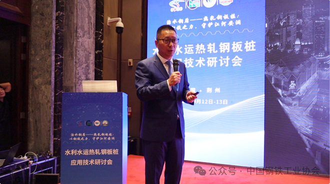 作為會議承辦方、工作組主任單位,河北津西鋼鐵集團股份有限公司總經理趙利欣介紹“破局之路”,技術應用研究所首席工程師(熱軋鋼板樁應用技術推廣工作組專家委員會主任)錢奕峰作《熱軋鋼板樁在水工領域的產品應用與發展》報告,詳解熱軋鋼板樁在水利領域應用的優點。他表示津西熱軋鋼板樁全球銷量占比超25%,獲中鋼協“金杯特優產品”稱號。在深中通道、黃茅海跨海通道中被稱為“定海神樁”;阜陽船閘項目中優化截麵設計節省造價500餘萬元;自主研發的生產監控係統實現全流程溯源,施工模擬平台可精準預判地質受力。錢奕峰表示“我們不僅提供材料,更提供‘設計+施工+售後’一站式解決方案。”