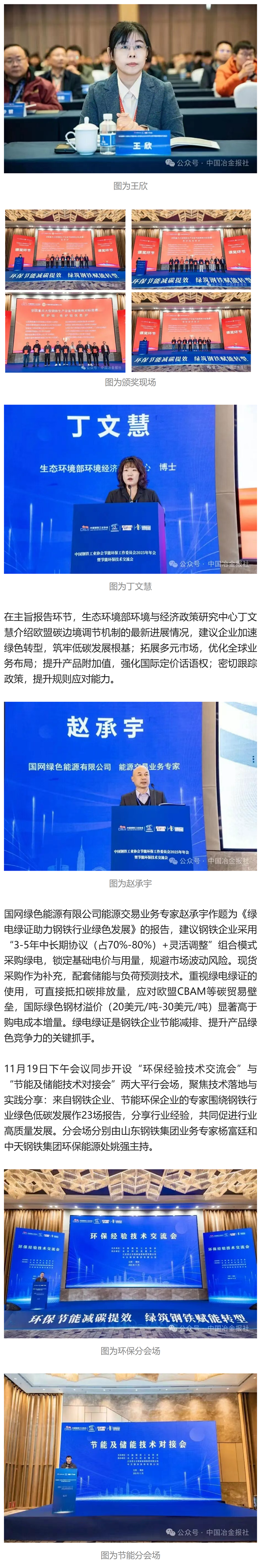 薑維在講話中係統梳理了“十四五”以來鋼鐵行業節能環保工作的三大顯著成效。一是鋼鐵行業在減量發展的“十四五”積累的寶貴經驗,為中國鋼鐵健康可持續發展增添了新的成色。進入“十四五”以來,國內鋼鐵表觀消費量連續4年下降,鋼鐵產量總體呈下降趨勢。其中,國內表觀消費量從2020年10.4億噸的峰值下降到2024年的8.9億噸,下降了1.5億噸,年均下降3.8%;2025年前三季度,國內表觀消費量為6.49億噸,下降5.7%,下降幅度進一步加大。鋼鐵行業積極探索,逐步形成堅持“三定三不要”的行業共識,行業自律意識、能力逐步提升。二是“十四五”鋼鐵行業超低排放攻堅破局取得卓越成果。截至今年10月底,共有219家鋼鐵企業完成或部分完成超低排放改造和評估監測。其中,165家鋼鐵企業完成全工序超低排放改造,涉及粗鋼產能約6.63億噸,噸鋼超低排放改造投資約為447.06元,噸鋼平均環保運行成本約為212.44元;54家鋼鐵企業完成部分工序超低排放改造公示,涉及粗鋼產能約1.88億噸;行業全麵完成超低排放改造的投入已超3100億元人民幣。三是極致能效工程係統挖潛,為節能降本增效做出貢獻。截至目前,四批申報“雙碳最佳實踐能效標杆示範廠”培育企業共143家,涉及產能約7.5億噸,為全行業達到節能目標、實現降本增效起到了積極推動作用。能效標杆示範創建工作得到了行業高度認同和積極參與。截至2025年11月中旬,共21家企業完成極致能效驗收公示,10家企業以“雙碳最佳實踐能效標杆示範企業”進行公示,11家企業以“雙碳最佳實踐能效標杆示範工序/設備”進行公示。2025年底,40家培育企業有望達到國家標杆水平。薑維表示,“十五五”是國家碳達峰的關鍵五年,鋼鐵行業作為傳統產業要積極融入碳市場,加快低碳技術進步,努力實現減汙降碳、節能降耗,努力實現中國鋼鐵低碳轉型和健康可持續發展“雙贏”。