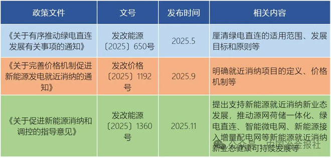這類原本更加技術性的探討,由於近期密集發布的國家政策,更多被廣泛關注和討論。僅2025年以來,國家有關部門就出台了包括《關於有序推動綠電直連發展有關事項的通知》《關於完善價格機製促進新能源發電就近消納的通知》《關於促進新能源消納和調控的指導意見》在內的就近消納相關政策文件,就近消納的定義、主要涵蓋範圍和定位進行定調。根據國家發展改革委、國家能源局2025年11月最新發布的《關於促進新能源消納和調控的指導意見》,新能源就近消納新業態包含源網荷儲一體化、綠電直連、智能微電網、新能源接入增量配電網等形式。