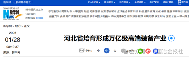 1月27日,新華網發布《河北省培育形成萬億級高端裝備產業》一文。