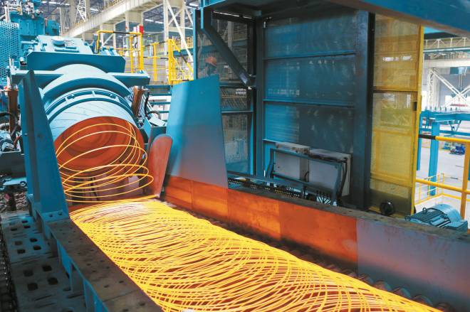 7月1日,世界第一座公鐵兩用斜拉橋——滬蘇通長江大橋正式通車。該橋所用斜拉索采用了中信泰富特鋼集團旗下興澄特鋼、青島特鋼自主研發生產的世界最高強度2000兆帕級纜索鋼絲用盤條,實現了2000兆帕級纜索鋼絲用盤條在特大型橋梁建設中的首次應用。據悉,該橋共有432根斜拉索,每根斜拉索由直徑7毫米的鋼絲組成,單根斜拉索成橋最大索力可達1000噸,能吊起600多輛小汽車。圖為興澄牌高強纜索盤條生產現場。 (特約通訊員 陸衛宇/ 攝 孫中偉 程文文/文)