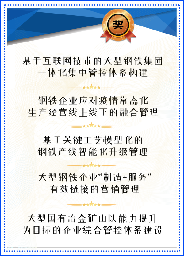 2021年全國企業管理創新大會日前召開,會上發布了第二十七屆全國企業管理現代化創新成果,河鋼5項管理成果獲全國企業管理現代化創新成果二等獎,不久前,河鋼還榮獲第十九屆中鋼協冶金企業管理現代化創新成果一等獎4項,獲第二十七屆河北省省級企業管理現代化創新成果一等獎39項,獲獎成果創曆史最好水平。