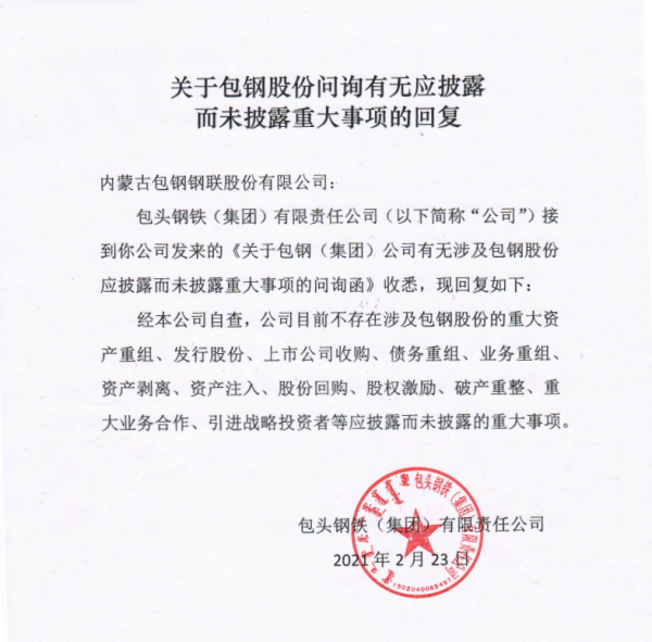 控股股東包鋼集團關於包鋼股份問詢有無應披露而未披露重大事項的回複