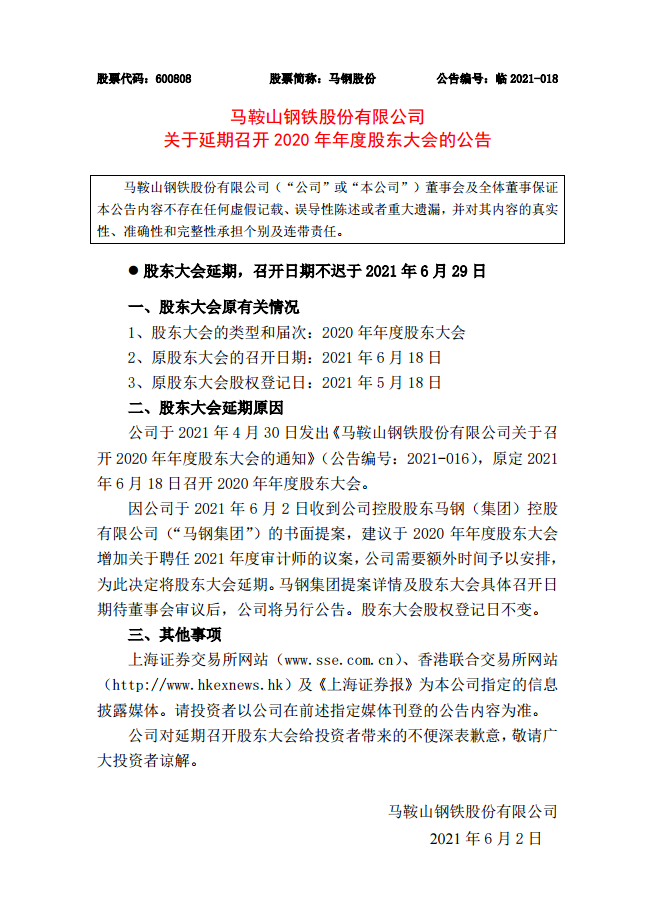 馬鞍山鋼鐵股份有限公司關於延期召開2020年年度股東大會的公告