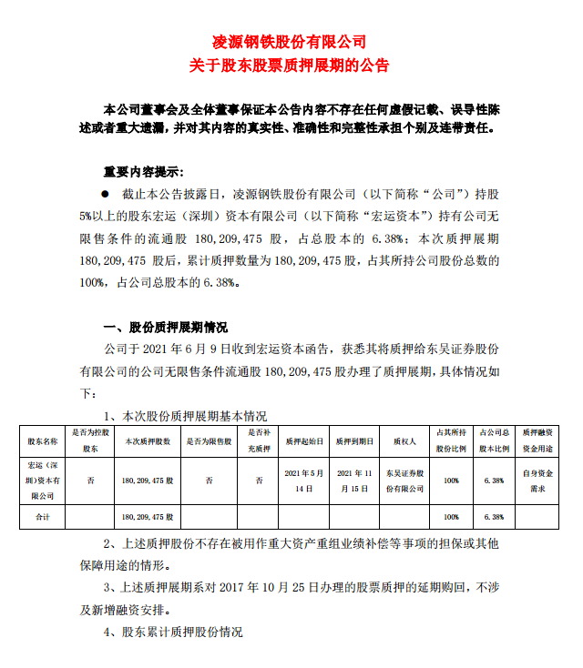 淩源鋼鐵股份有限公司關於股東股票質押展期的公告