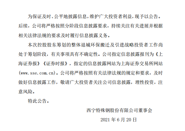 西寧特殊鋼股份有限公司關於控股股東籌劃重大事項的提示性公告