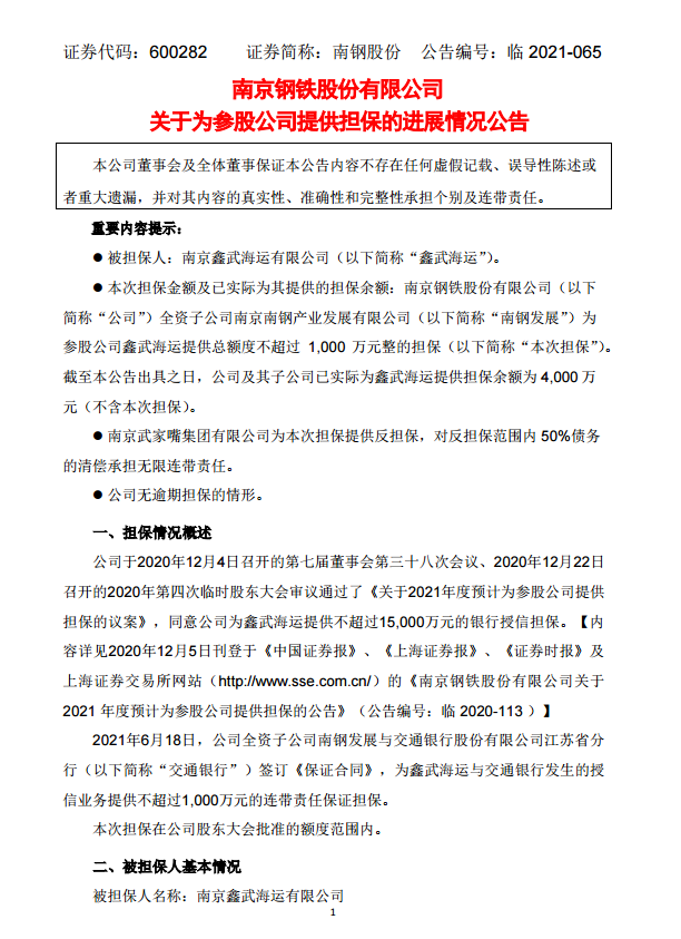 南京鋼鐵股份有限公司關於為參股公司提供擔保的進展情況公告