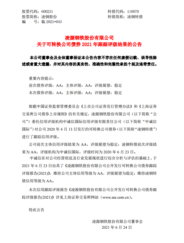 淩源鋼鐵股份有限公司關於可轉換公司債券2021年跟蹤評級結果的公告