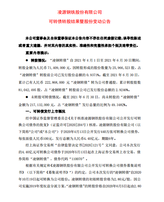 淩源鋼鐵股份有限公司可轉債轉股結果暨股份變動公告
