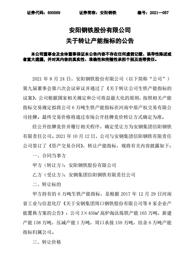 安陽鋼鐵股份有限公司關於轉讓產能指標的公告