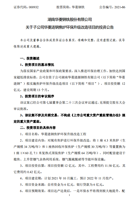 華菱鋼鐵:關於子公司華菱漣鋼焦爐環保升級改造項目的投資公告