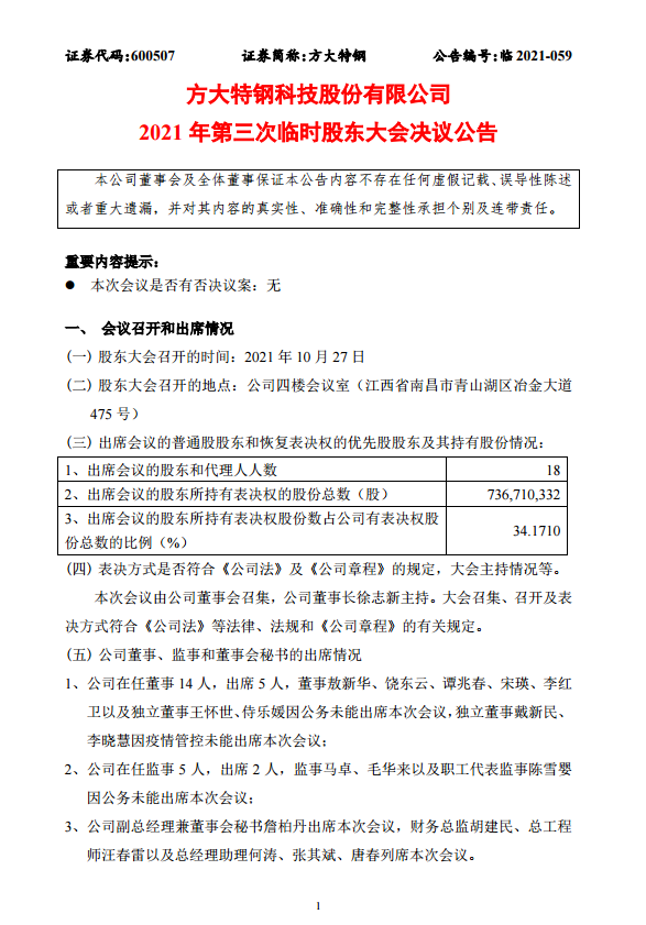 方大特鋼2021年第三次臨時股東大會決議公告
