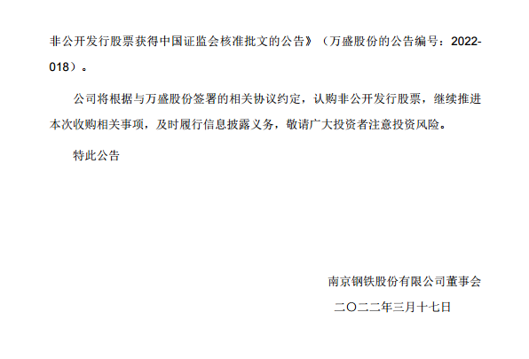 南京鋼鐵股份有限公司關於收購浙江萬盛股份有限公司的進展公告